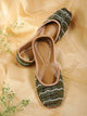 A pair of green embellished round toe flats, has regular styling, with slip-on closure